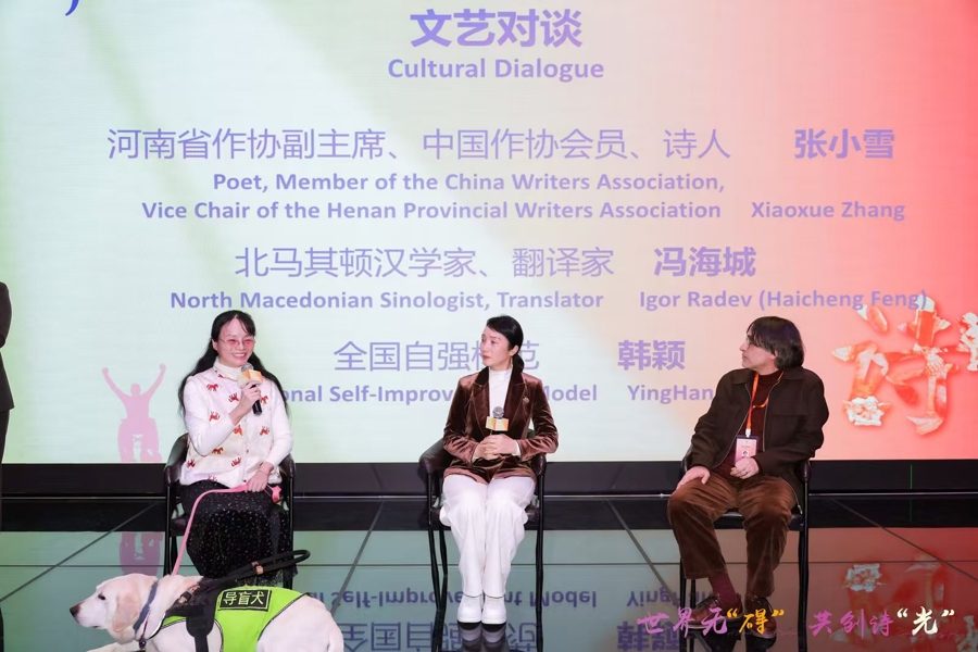 “我扶着手杖,既是音符,也是指挥棒/左脚追问土地,右脚回答海浪/节拍里,我把自己,走成一张活地图/我翻译斜坡的暗语,也懂得台阶的叹息/把每一次颠簸,改写成平坦的韵脚/让后来者的脚印,不再踉跄……”12月9日晚,上海书城福州路店里,诗意流淌、暖意融融,视障者王林与听障者王玉婷以朗诵与手语结合的形式演绎了残疾诗人陈艺新创作的《双重奏》,全场响起热烈掌声。