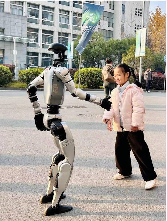 孩子们与机器人开心互动。湖北省机械工程学会供图